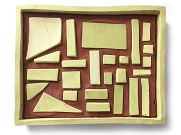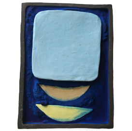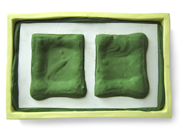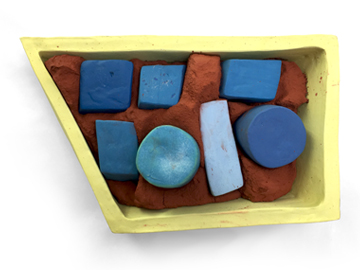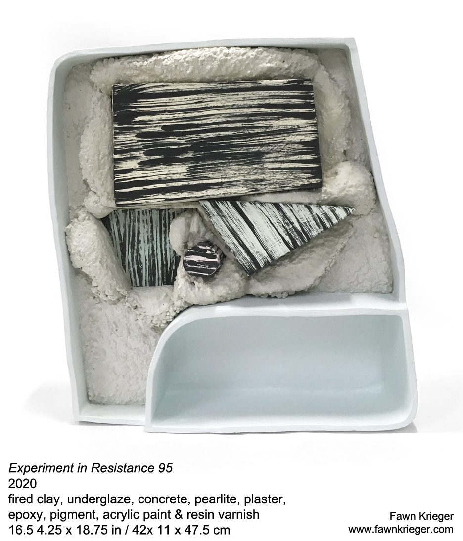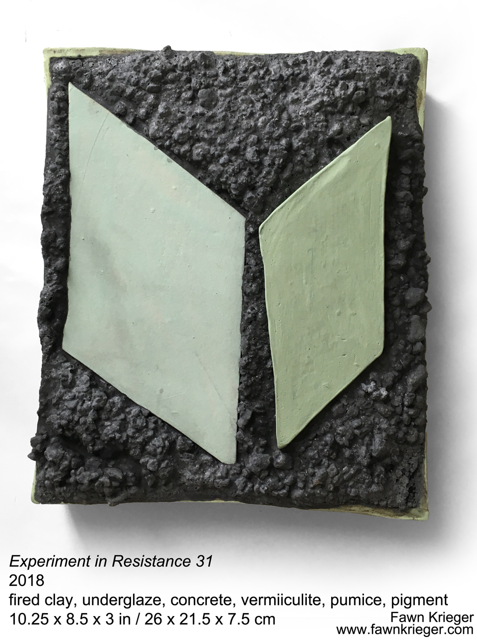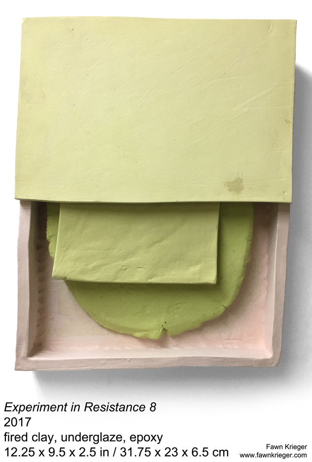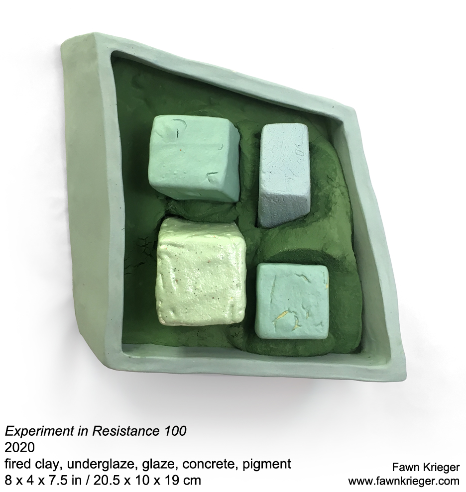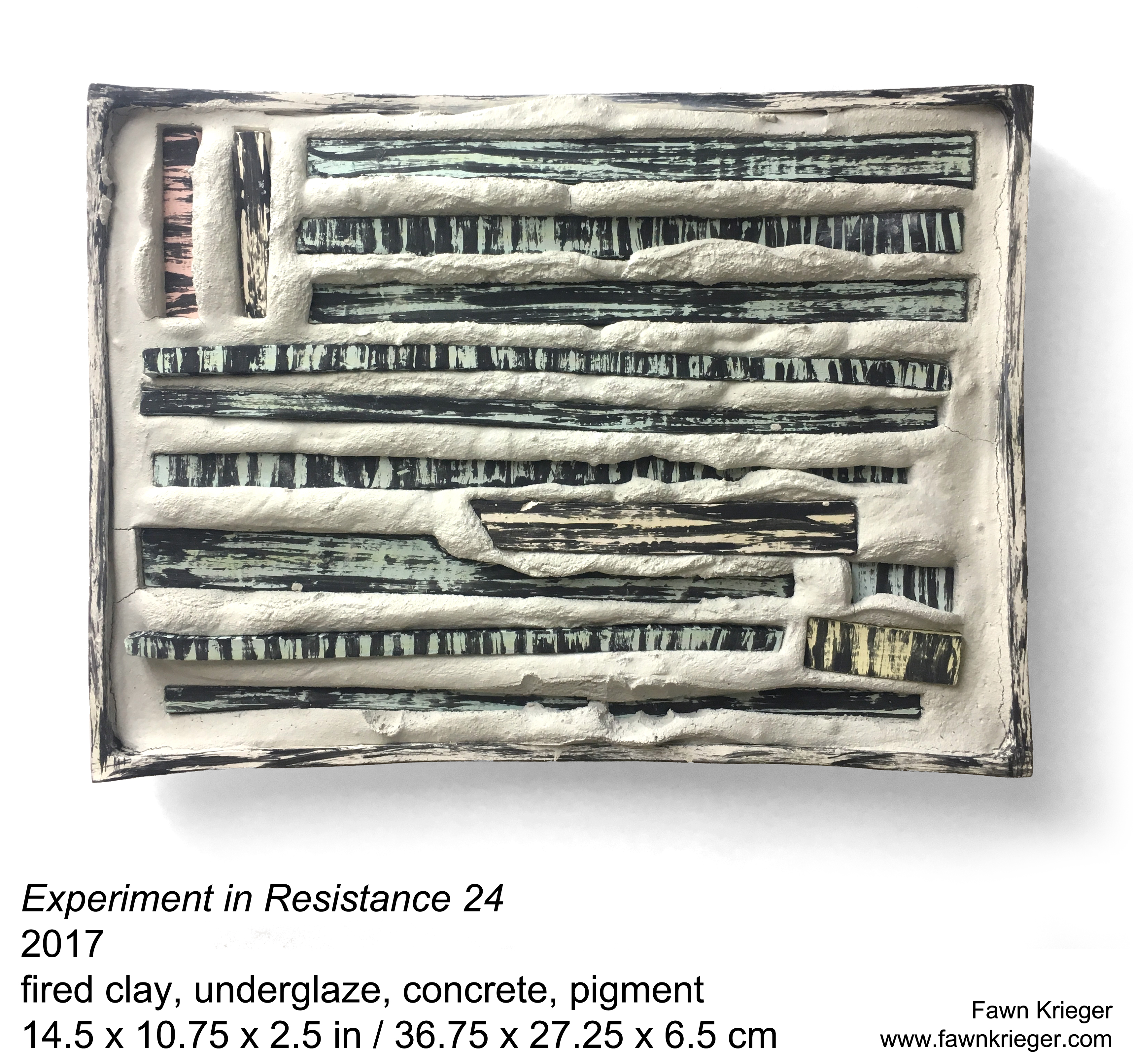 In this body of work, entitled Experiments in Resistance, I press under-glazed and fired clay volumes into ceramic troughs containing wet, usually dyed cement. The clay is pressed at various depths and at different times in the cement's drying time, allowing me to study a vocabulary of haptic pressure, a process of petrifying displacement, and the impact caused from a soft collision between material bodies. I began the series in early 2017, after the U.S. presidential inauguration. Rendered in Atomic-Era colors, and scaled to the hand-held, the work capriciously recalls associations of both play and pressure. These sculptures perform as artwork but fundamentally exists as concrete artifacts, storing a memorial archive of environmental and corporeal events encircling phenomena of refusal, surrender, and dispersal. |